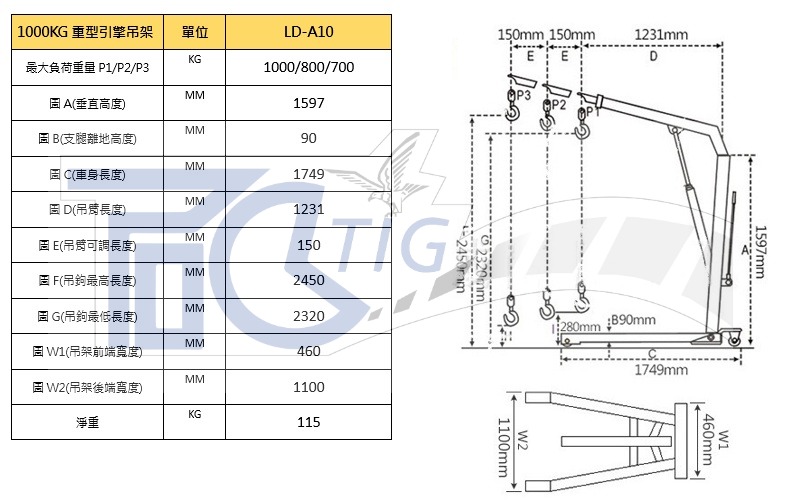 TIG 啟思重系列:歐式重型吊架 500-2000kg 折疊油壓吊架(保固一年.本工廠都有維修)