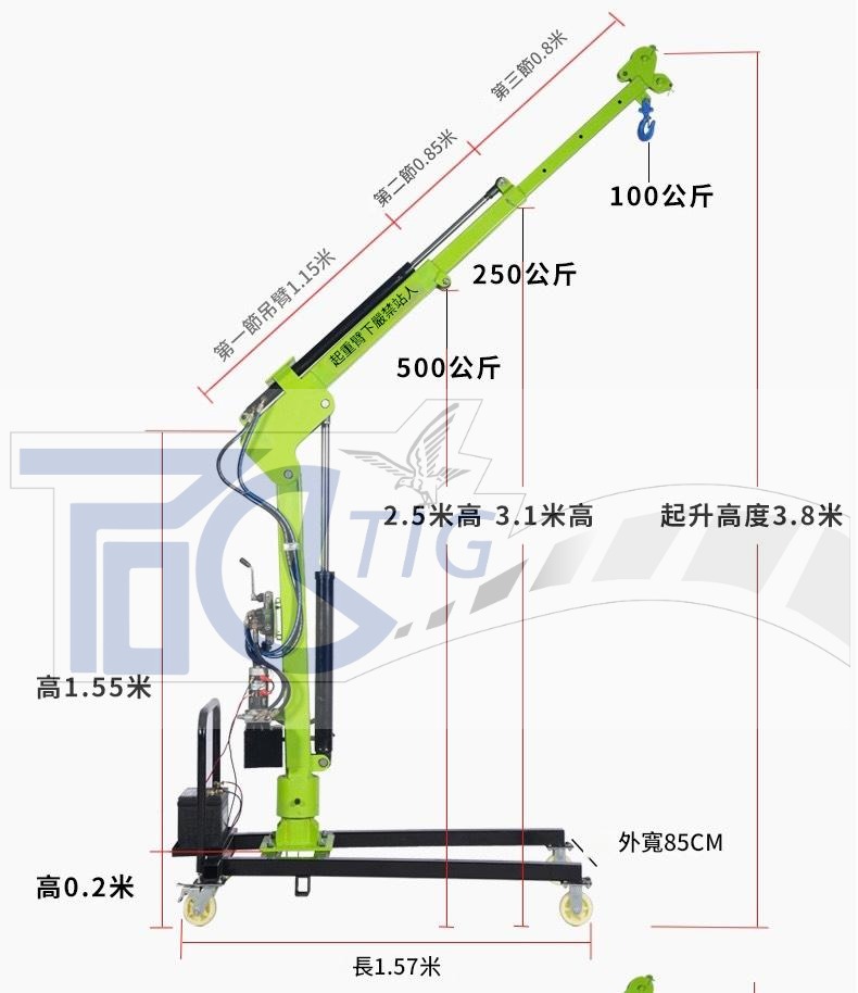 2.三段伸縮吊臂: 吊臂可三段伸縮調節 (2.5M米/3.1米/3.8米),滿足不同距離的起吊需求。