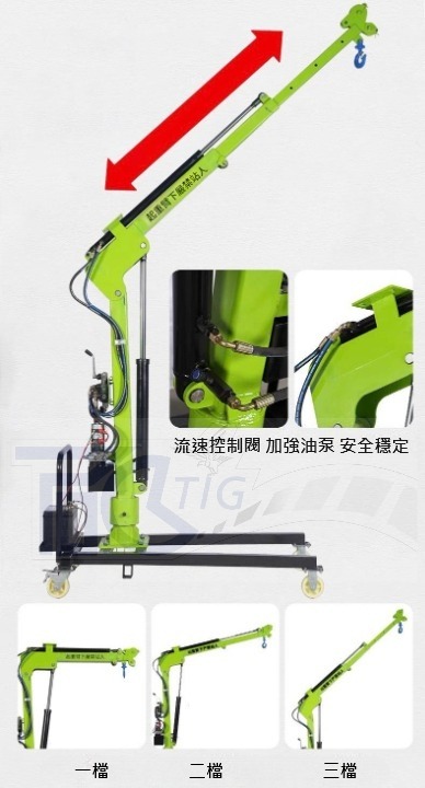 2.三段伸縮吊臂: 吊臂可三段伸縮調節 (2.5M米/3.1米/3.8米),滿足不同距離的起吊需求。
